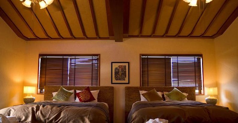 アジアンリゾートのような雰囲気が特徴的な広々とした空間 コテージ泊楽 たびらい沖縄